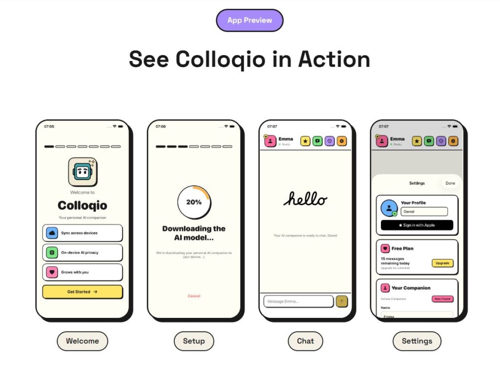 Unlike many AI assistants that send user data to cloud servers, Colloqio runs entirely on your device, keeps conversations local, and offers a conversational partner that “remembers you” — all without collecting or storing your personal data online.