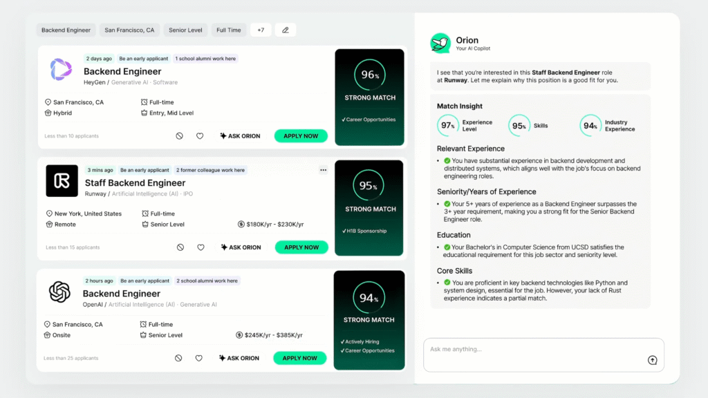 Their “Orion” AI copilot offers role guidance, helps you understand how you match a role, and gives career insights. - Visa / Sponsorship Filters